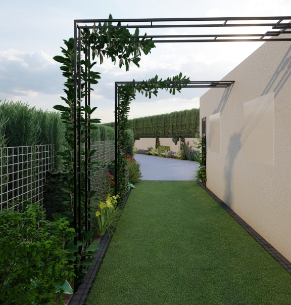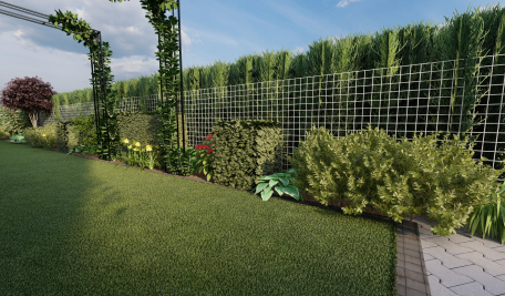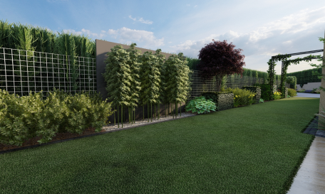 W pierwszej rabacie, bliżej tarasu zaprojektowałam bambusy na tle czarnych metalowych paneli, w towarzystwie czerwonego buka, host,strzyżonych cisów. Wybrałam rośliny o różnych formach, kolorach liści,fakturach, dlatego by idąc wzdłuż długiej rabaty na każdym kroku coś się działo, zachwycało i zachęcało do dalszego spaceru. Na wysokości garażu zaprojektowałam metalowe podpory pod pnącza, stylem nawiązujące do fontanny. Wzdłuż podjazdu część lawendy została usunięta, w zamian posadzono różnej wysokości formowane żywopłoty, trawy, lawenda oraz wiciokrzewy.
